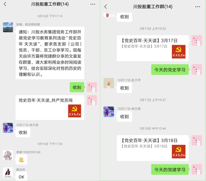 四川川投船重環(huán)境科技有限公司響應(yīng)國家及川投集團(tuán)、川投水務(wù)集團(tuán)關(guān)于開展黨史學(xué)習(xí)教育系列活動(dòng)的具體要求,從3月16日開始,利用微信每日組織公司全體人員學(xué)黨史、用黨史。