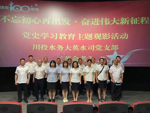 為深入開展黨史學習教育,慶祝中國共產(chǎn)黨成立100周年,進一步在企業(yè)中興起觀看紅色影片、更加愛黨愛國的持續(xù)熱潮。根據(jù)川投水務(wù)集團黨史學習教育領(lǐng)導(dǎo)小組通知要求和公司黨支部七月主題黨日活動計劃。7月28日下午,大英水司黨支部組織全體黨員、預(yù)備黨員、入黨積極分子,在大英永逸電影院5號廳觀看紅色電影《革命者》。進一步引導(dǎo)黨員干部群眾發(fā)揚紅色傳統(tǒng),傳承紅色基因,賡續(xù)紅色血脈。