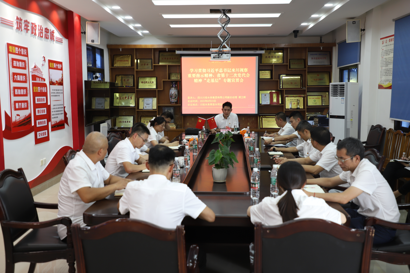 為堅持以習(xí)近平新時代中國特色社會主義思想為指導(dǎo),貫徹落實習(xí)近平總書記對四川工作系列重要指示精神,根據(jù)川投水務(wù)集團(tuán)黨委《關(guān)于認(rèn)真做好學(xué)習(xí)貫徹習(xí)近平總書記來川視察重要指示精神和省第十二次黨代會精神“走基層”專題宣講的通知》文件要求,8月23日下午,川投水務(wù)集團(tuán)副總經(jīng)理譚衛(wèi)鵬一行赴榮縣水司開展學(xué)習(xí)貫徹習(xí)近平總書記來川視察重要指示精神暨省第十二次黨代會精神“走基層”專題宣講活動,榮縣水司領(lǐng)導(dǎo)班子成員、黨員干部參加了活動。