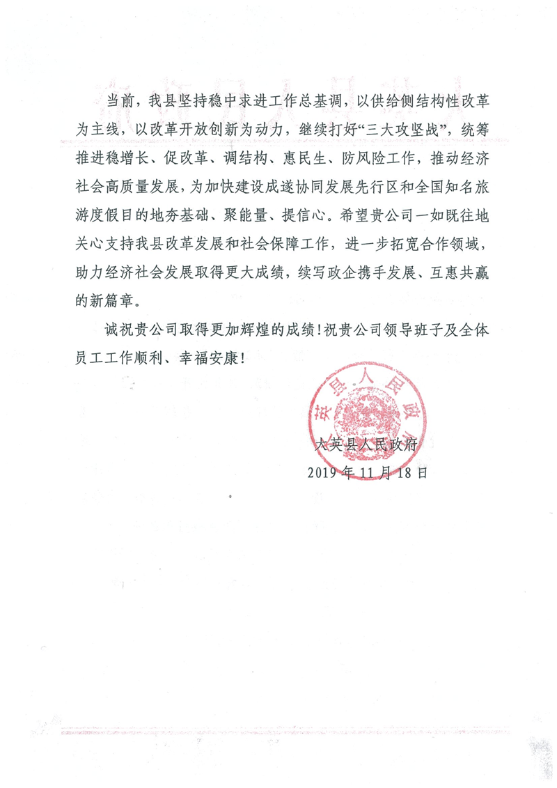 文副縣長首先對川投集團(tuán)、川投水務(wù)長期以來對大英縣經(jīng)濟(jì)社會發(fā)展的關(guān)心與支持表示感謝。文副縣長指出川投水務(wù)大英公司積極提升服務(wù)質(zhì)量和供水保障能力,主動為政府排憂解難,助推城市建設(shè)發(fā)展,尤其是大英第二水廠建設(shè)期間,在經(jīng)歷幾易廠址、資金緊缺的困難下,利用管理和技術(shù)優(yōu)勢,高效推進(jìn)并成功建成投產(chǎn),徹底解決了大英縣城16萬居民及百余家企業(yè)生產(chǎn)生活用水問題,以實(shí)際行動詮釋了國企擔(dān)當(dāng)和責(zé)任,并希望川投水務(wù)大英公司能在管網(wǎng)改造、而二水廠二期工程建設(shè)方面提前謀劃,同時(shí)表達(dá)了與川投水務(wù)在更廣領(lǐng)域深化合作的意愿。