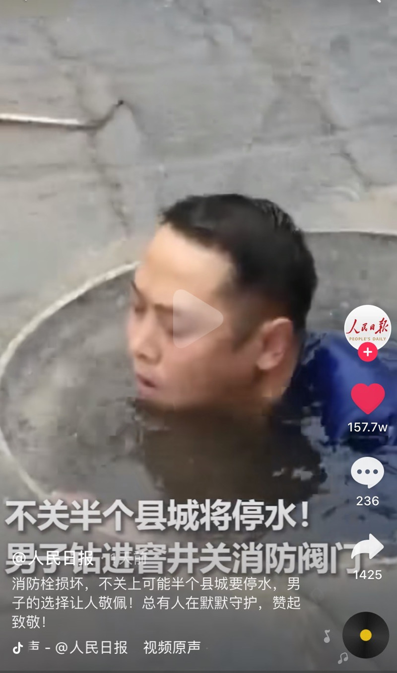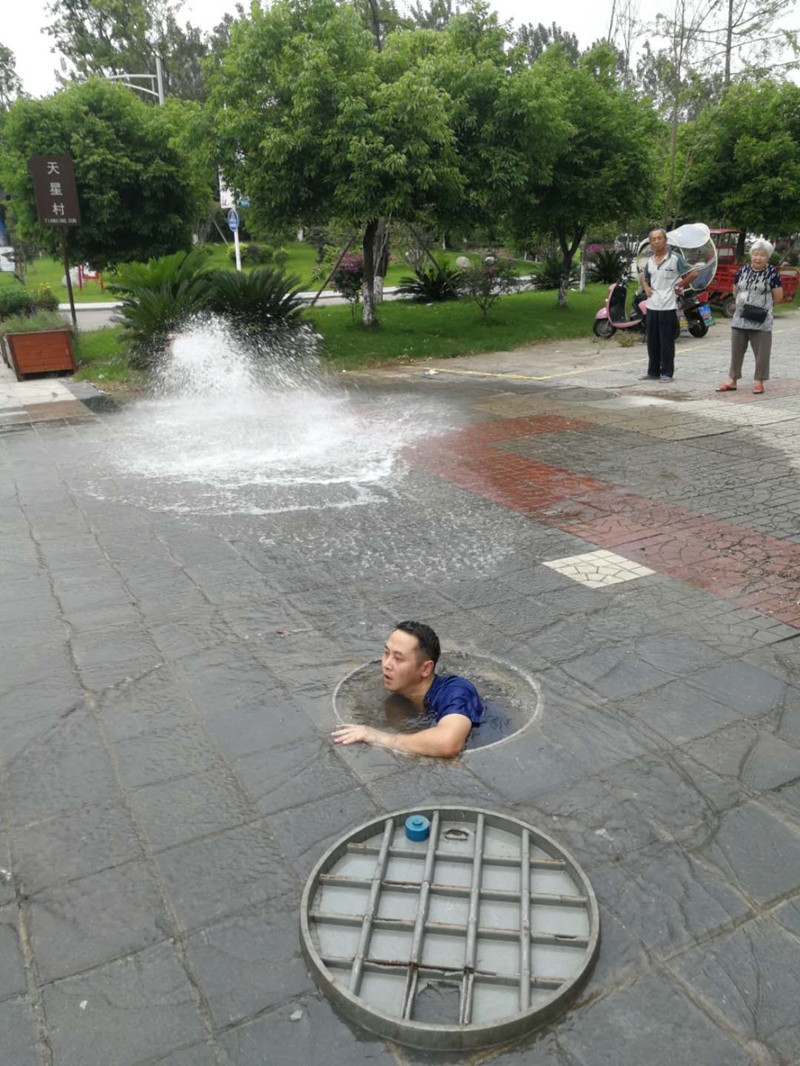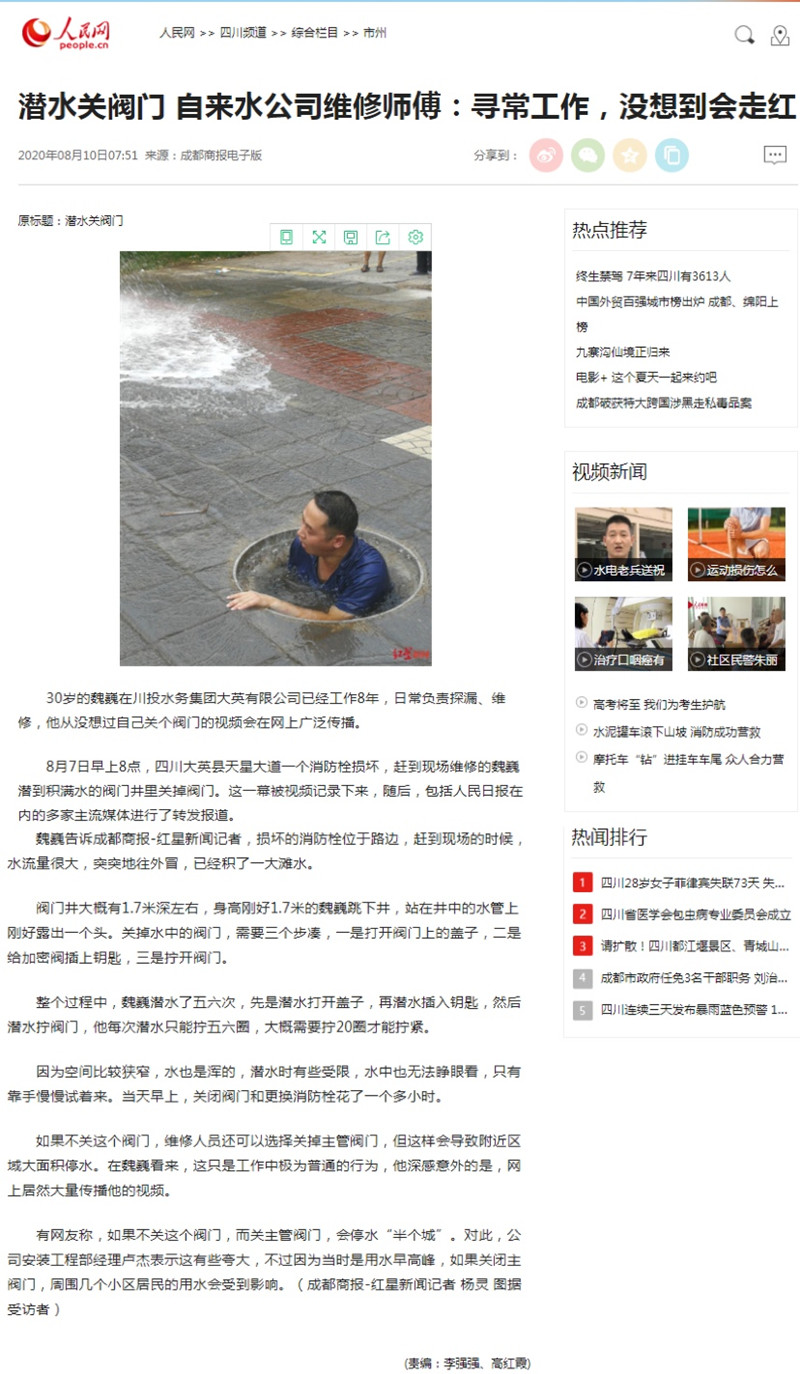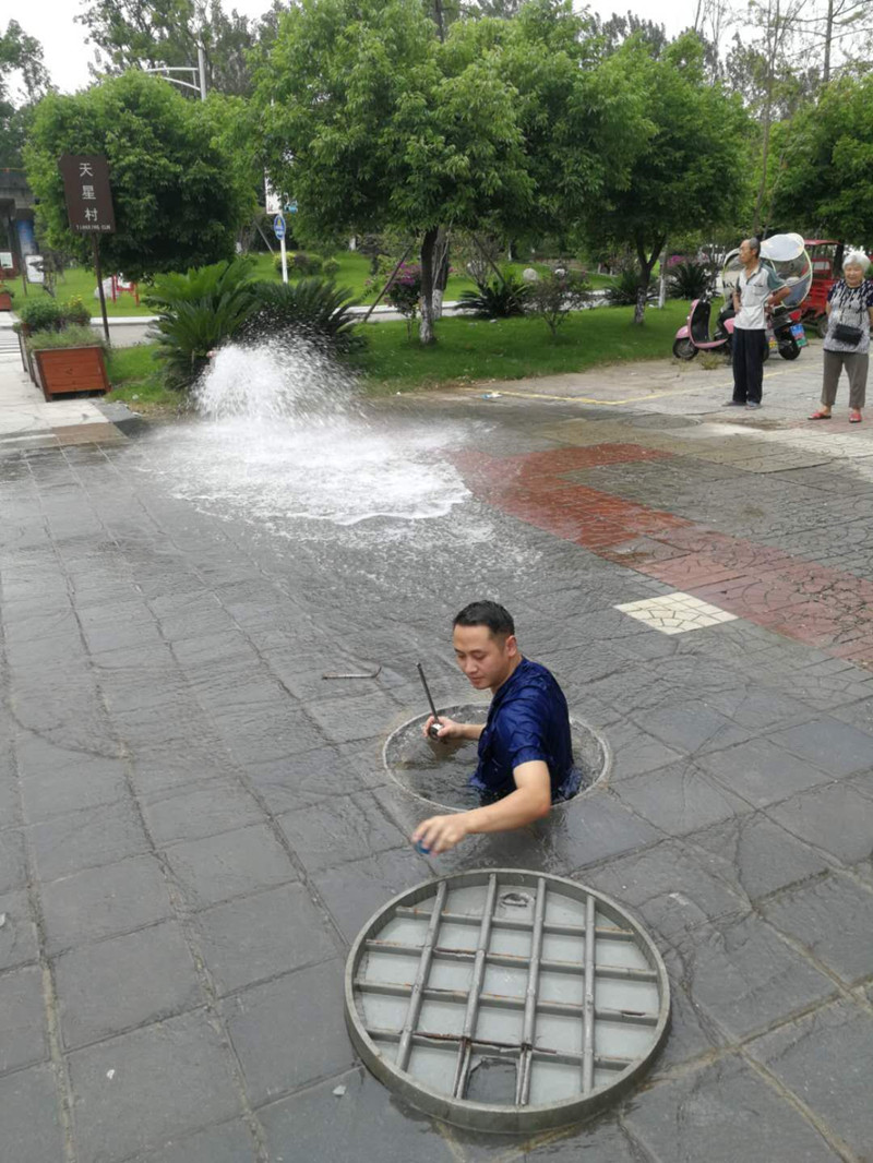 事情的經(jīng)過是這樣:2020年8月7日早上8時許,四川省大英縣天星大道一消防栓損壞,川投水務(wù)大英水司聞訊第一時間組織維修搶險隊伍前往現(xiàn)場排險處置。當維修人員趕到現(xiàn)場時,消防水呈水柱狀外噴,不僅路面大量積水,閥門井也早已被外噴的消防水灌滿。此時正值用水早高峰,如果選擇關(guān)掉主管閥門,將會導致附近區(qū)域大面積停水。為了最大限度保障城區(qū)居民用水,視頻中的主人公魏巍不假思索地撬開閥門井蓋,在短短1分多鐘時間內(nèi)5次潛至近2米深的水下成功關(guān)閉閥門,并以最快的速度更換損壞的消防栓,恢復了該片區(qū)的正常供水,沒有引發(fā)大面積停水。