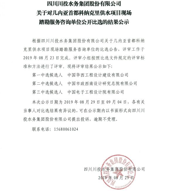 上一條:四川川投水務(wù)集團股份有限公司 關(guān)于幾內(nèi)亞首都科納克里供水項目現(xiàn)場踏勘服務(wù)咨詢單位比選公告