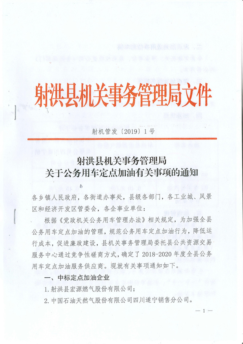 2019年1月2日,開年上班第一天,宏源公司收到射洪縣公共資源交易服務(wù)中心的“射洪縣2018—2020年度公務(wù)用車定點(diǎn)加油政府采購(gòu)項(xiàng)目”的中標(biāo)通知書。在此次全縣公務(wù)用車定點(diǎn)加油采購(gòu)項(xiàng)目競(jìng)爭(zhēng)性磋商中,宏源公司以406分第一名的最高評(píng)審得分成功中標(biāo)。
