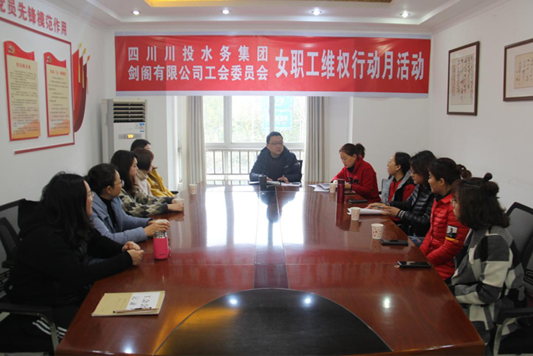 2019年3月21日,劍閣水司工會主席、副總經理韓名泉帶領工會委員白橋及公司10余名女職工在下寺會議室,開展了以“貫徹落實男女平等基本國策,促進工作場所性別平等”為主題的女職工維權行動月活動,著力推動解決女職工在勞動就業(yè)、生育保護、職業(yè)待遇等促進工作場所性別平等存在的突出問題,依法維護女職工合法權益和特殊利益。