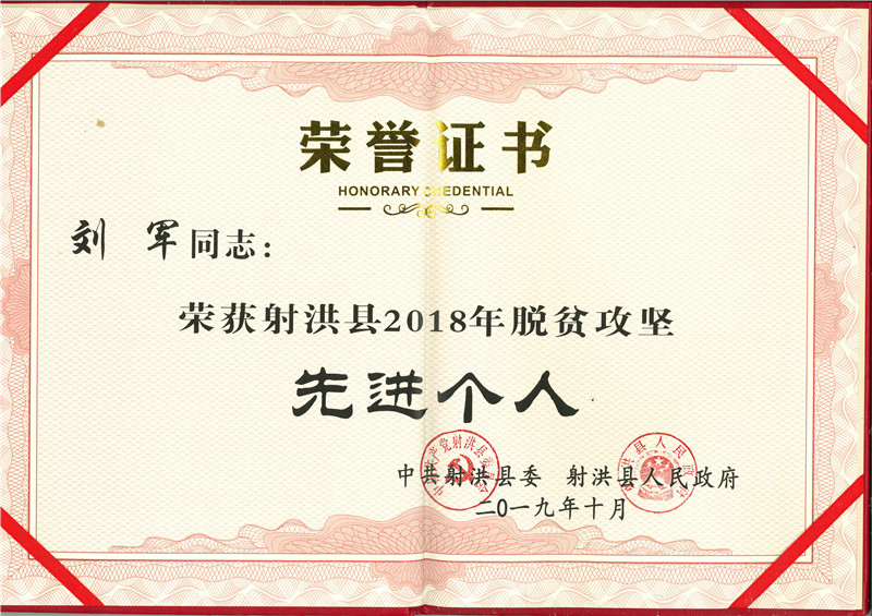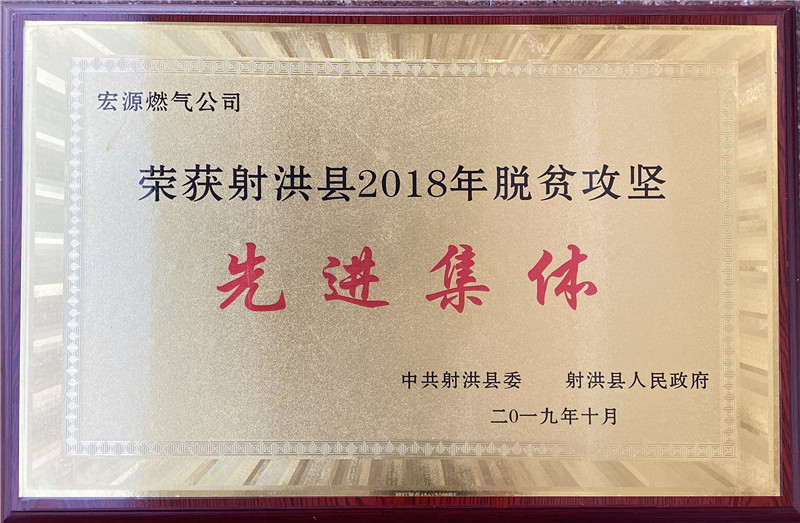 2019年10月15日,在射洪縣文化藝術(shù)中心召開的“大愛扶貧  濟(jì)善射洪—2019年射洪縣脫貧攻堅(jiān)暨社會(huì)扶貧工作推進(jìn)會(huì)”上,宏源公司被中共射洪縣委、射洪縣人民政府表彰為“射洪縣2018年度脫貧攻堅(jiān)先進(jìn)集體”,公司團(tuán)委書記、大榆鎮(zhèn)飛石溝村駐村工作隊(duì)隊(duì)員劉軍被表彰為“射洪縣2018年度脫貧攻堅(jiān)先進(jìn)個(gè)人”。