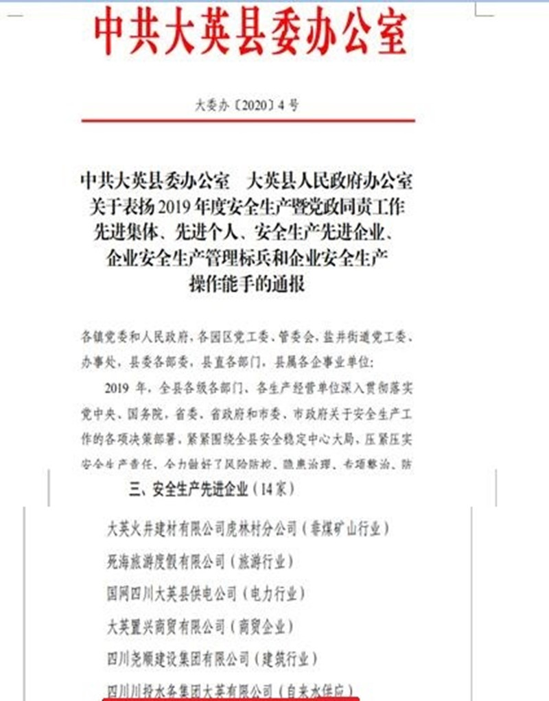 在大英縣2019年度安全生產暨黨政同責工作中,大英水司獲得大英縣“安全生產先進企業(yè)”榮譽。