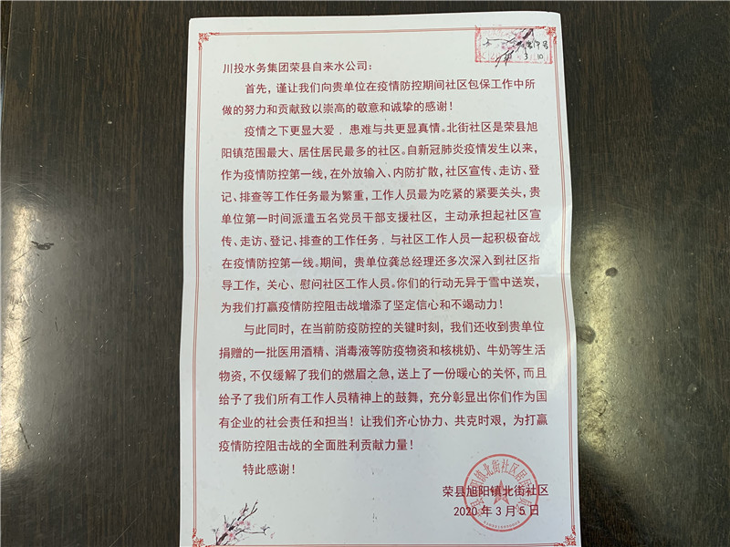 “非常感謝你們在疫情防控特殊時期第一時間支援我們北街社區(qū),緩解了我們的燃眉之急!”3月10日上午,榮縣旭陽鎮(zhèn)北街社區(qū)主任梁玉蓉代表北街社區(qū)向公司送上“疫情之下顯大愛,患難與共顯真情”的錦旗和一封感謝信,對在疫情防控期間社區(qū)包保工作中所做的努力和貢獻表達了崇高的敬意和誠摯的感謝。