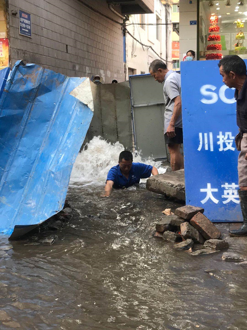 接到報(bào)漏后,大英公司第一時(shí)間組織搶修隊(duì)到達(dá)現(xiàn)場(chǎng),仔細(xì)查看,為了保證安全,決定立即進(jìn)行打圍處理。同時(shí),搶修員不顧水壓沖擊和水下不明安全隱患,毅然下到水坑,屏住呼吸,沉入水下,探找水閥開(kāi)關(guān),近30分鐘后,爆管位置水下閘閥關(guān)停,路面積水開(kāi)始回落。