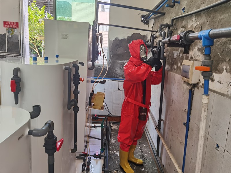 搶險人員分為兩組同時進行搶險,第一組搶險人員穿好耐酸堿防護服,戴好防毒面具,進入加藥車間切斷二氧化氯機電源,打開通風設備和尋找泄漏點;第二組搶險人員為防止二氧化氯氣體大面積擴散,站在上風口利用高壓水槍對泄露的二氧化氯氣體進行稀釋,并準備好干粉滅火器防止設備因線路故障導致自燃。整個演練過程嚴謹、有序,各應急隊伍協(xié)調(diào)配合,有條不紊。