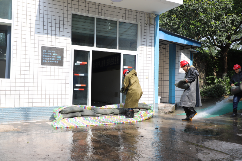 防洪防汛防澇應急演練,模擬在天氣突然強降雨的情況下,值班人員發(fā)現險情向部門負責人報告,部門負責人接到險情報告并請示龔總后,按照演練方案立即啟動防洪、防汛、防澇應急預案。參演人員迅速采取應急措施,用擋水板、沙袋進行防護,阻擋洪水進入泵房,泵房內有積水時迅速用排水泵將積水排出泵房外,同時水質化驗人員對水質進行檢測,水質檢測后演練結束。