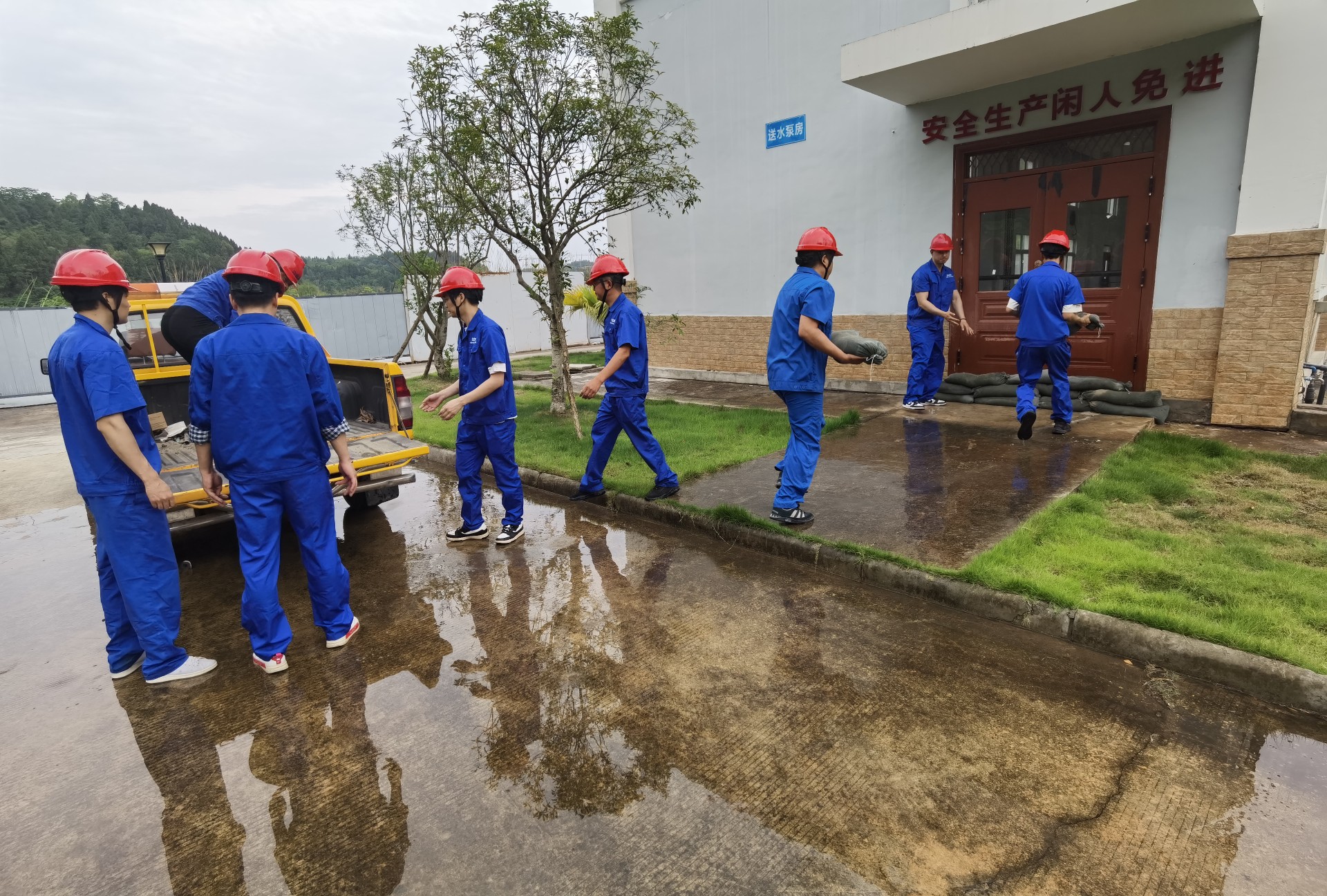 各部門迅速響應(yīng),搶險人員快速集結(jié)出動,車輛物資等后勤保障快速到位,用最快的速度趕赴險情點。裝運沙袋、碼袋堵漏、抽排積水、化驗水質(zhì)、疏通廠區(qū)內(nèi)排洪溝,本次演練共出動搶險車3輛,參演人員達(dá)40余人。演練中,各組人員分工明確,指揮小組現(xiàn)場指揮有力,各個演練環(huán)節(jié)緊密有序,達(dá)到了預(yù)期效果和實戰(zhàn)目的。