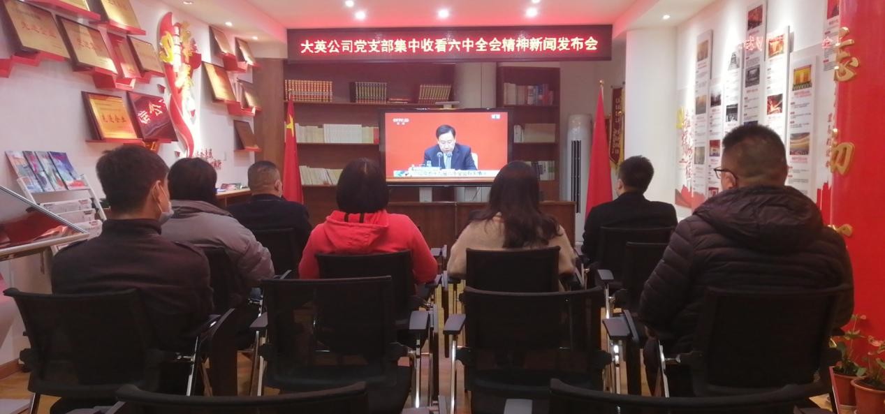 11月12日上午10時(shí),中共中央在北京舉行新聞發(fā)布會(huì),介紹黨的十九屆六中全會(huì)精神,并答記者問(wèn)。川投水務(wù)大英公司黨支部積極組織廣大黨員干部,在五樓黨員活動(dòng)室,集中收看新聞發(fā)布會(huì)現(xiàn)場(chǎng)直播,工作一線、外勤黨員,通過(guò)手機(jī)、電腦等多種形式,學(xué)習(xí)全會(huì)公報(bào)內(nèi)容,認(rèn)真領(lǐng)會(huì)本次全會(huì)精神。