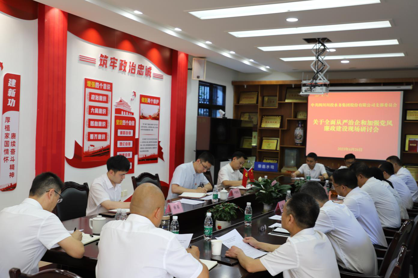 6月26日,為全面貫徹落實(shí)從嚴(yán)治黨主體責(zé)任,深入推進(jìn)基層黨風(fēng)廉政建設(shè)工作,川投水務(wù)集團(tuán)黨委委員、副總經(jīng)理嚴(yán)斯亮同志帶領(lǐng)調(diào)研小組赴榮縣水司開(kāi)展“全面從嚴(yán)治企和加強(qiáng)黨風(fēng)廉政建設(shè)”現(xiàn)場(chǎng)專題調(diào)研會(huì),榮縣水司領(lǐng)導(dǎo)班子成員、中層副職以上及群眾代表共計(jì)14人參加會(huì)議。