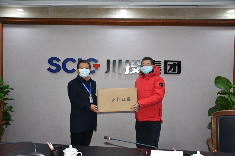 會后,李總代表川投集團將2000只一次性口罩交到梁董事長手中。