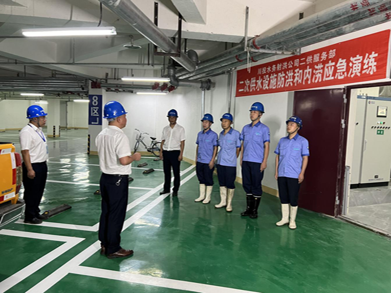 為及時有效應(yīng)對洪澇、雨澇災(zāi)害,提高泵房救災(zāi)處置能力,最大程度減少洪澇災(zāi)害造成的城市二次供水泵房損失,川投水務(wù)射洪公司于8月28日下午在射洪市“郁金香”三期小區(qū)二次供水泵房開展了一場汛期泵房防洪和內(nèi)澇應(yīng)急演練,公司副總經(jīng)理杜剛?cè)慰傊笓],二供服務(wù)部經(jīng)理龐加模任應(yīng)急救災(zāi)組組長,安全監(jiān)察部等相關(guān)人員參加演練。